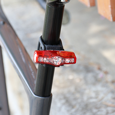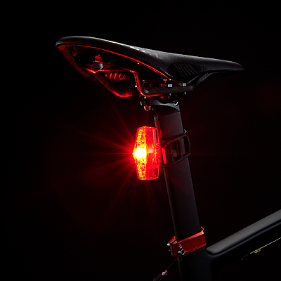 - 走行時の振動と周囲の暗がりを感知し、自動で点灯
