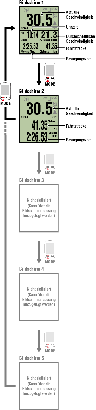 Sie können die Anzeige der Messdaten in Cateye Cycling™ mit Hilfe der Taste MODE umschalten.