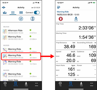 It is possible to check individual activities (trip data and summary data collectively) saved in Cateye Cycling™.