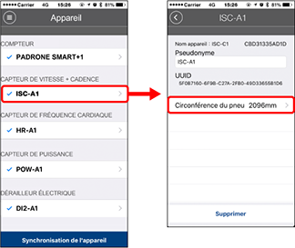 Appuyez sur [Appareil], puis appuyez sur [Nom du capteur] > [Circonférence du pneu] (la longueur de la circonférence extérieure du pneu).