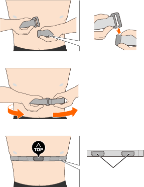 Entourez la ceinture thoracique autour de votre corps et réglez la longueur pour l'adapter à votre poitrine (sous le buste). Ne serrez pas de trop la ceinture car cela pourrait être inconfortable pendant la mesure.