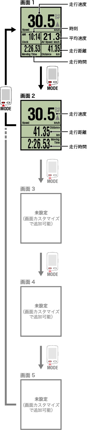 ※ 初期設定では、画面3〜5は未設定(非表示)です。必要に応じて画面の表示や画面分割・計測データを変更してください。