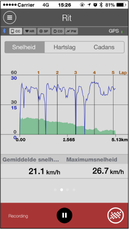 Door over het scherm te vegen schakelt u naar de kaartweergave, grafiekweergave en kunt u het verloop van de rit controleren.