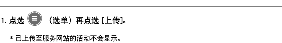 您可一次将所有活动上传至服务网站。 智能手机 ﷯ 1. 点选 ﷯ (选单)再点选 [上传]。 * 已上传至服务网站的活动不会显示。