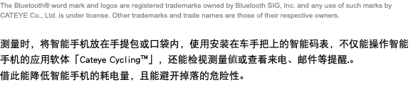 The Bluetooth® word mark and logos are registered trademarks owned by Bluetooth SIG, Inc. and any use of such marks by CATEYE Co., Ltd. is under license. Other trademarks and trade names are those of their respective owners. 测量时,将智能手机放在手提包或口袋内,使用安装在车手把上的智能码表,不仅能操作智能手机的应用软体「Cateye Cycling™」,还能检视测量値或查看来电、邮件等提醒.。 借此能降低智能手机的耗电量,且能避开掉落的危险性。