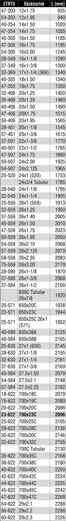 Kontrollera däckets omkrets (L) genom att titta på däcktabellen eller genom att mäta den faktiska omkretsen på din cykels däck.